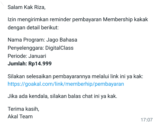 Sejak pakai Akal, nggak perlu lagi riweuh rekap kiriman bukti konfirmasi bayar para peserta kelas. Administrasi kelas jadi lebih rapi secara otomatis. Bersyukur juga fitur skema cicilannya sudah semakin rapi, jadi bisa kasih keringanan ke banyak peserta kelas yang membutuhkan. Terima kasih Akal 😊